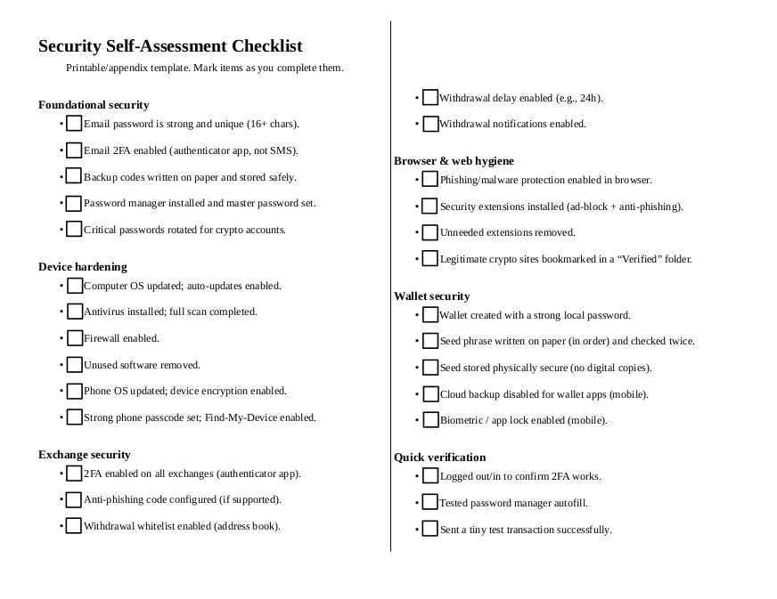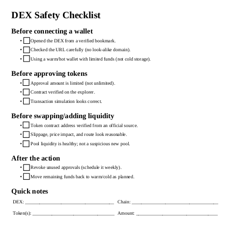 Because the crypto space is full of vague advice: "Don't click bad links." "Check your approvals." "Use cold wallets." These are correct—but useless if you can't remember them under pressure or market excitement. You need a system. Not scattered tips. Not hope.