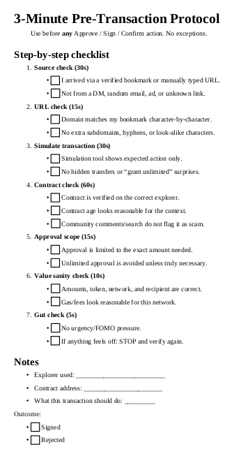 Adopt the 3‑Minute Pre‑Transaction Verification Protocol before every "Approve / Sign."